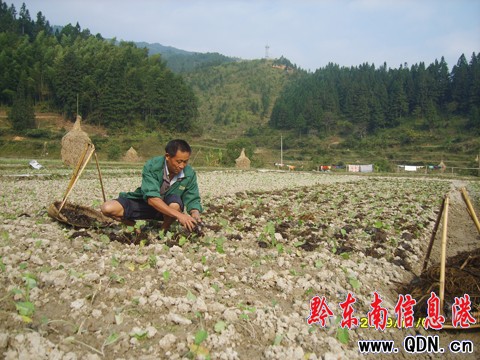 通過近月的努力,高寨村現已提前完成鄉黨委政府下達給該村的1300畝無公害油菜栽種任務。圖為高寨村村民原村黨支部書記歐志高正在自家的責任田里給油菜施用農家肥的情景。