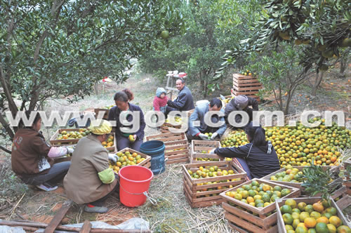 據貴州日報消息 錦屏縣龍池萬畝果場經營面積14500多畝,主要生產椪柑和金秋梨,是錦屏縣農業產業結構調整的骨干基地之一。該場從1999年掛果以來共產鮮果97050噸,創產值9655萬元,果場帶動當地8個村3000多戶農家實現增收,果品收入已占當地農戶總收入的60%以上。圖為龍池萬畝果場果農在分揀椪柑。