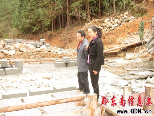 圖為鎮(zhèn)黨委書記與分管副鎮(zhèn)長在檢查工程建設(shè)情況