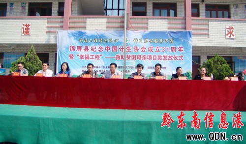 5月27日上午,錦屏縣紀念中國計劃生育協(xié)會成立31周年暨“幸福工程”—救助貧困母親項目款發(fā)放儀式在鐘靈鄉(xiāng)隆重舉行。來自黔東南州“計生協(xié)”秘書長游過環(huán)、錦屏縣副縣長閔啟勝、縣屬相關(guān)工作部門領(lǐng)導(dǎo)和從江、榕江縣“計生協(xié)”副會長、鐘靈鄉(xiāng)黨委政府領(lǐng)導(dǎo)及相關(guān)工作站所負責人、本次受助貧困母親及村寨文藝隊員和部分群眾代表以及中小學(xué)師生等共計2000多人參加了本次活動。