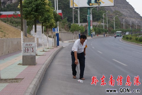 本港訊 (記者 劉仙 攝影報道)昨日,記者在韶山北路、北京西路等街道看見有人帶著黃袖套撿廢紙、塑料袋等垃圾,經詢問才得知,原來,他們是凱里市環衛處的工作人員,在全市建設文明衛生城市之際,他們欲用自己的實際行動讓帶動全市人民一起保護環境,保持凱里文明衛生城市的形象,凱里建設得更加美麗。