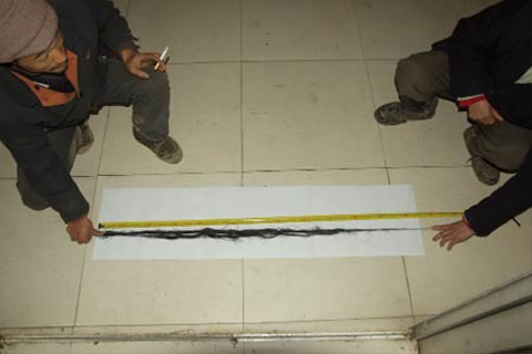神農架自然保護區11月27日晚接到報告稱,小當陽村村民在山上采藥時,撿到一束極似人發的“野人毛”,為黑色發絲狀物,呈扁平,有輕微卷曲,表面無光澤,測量最大長度近1.4米。