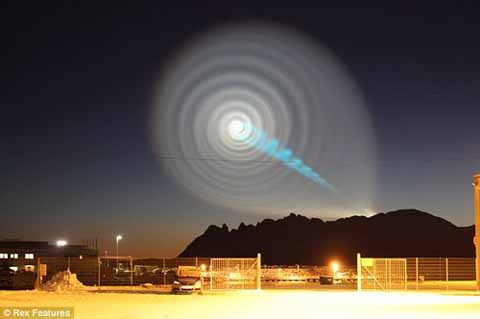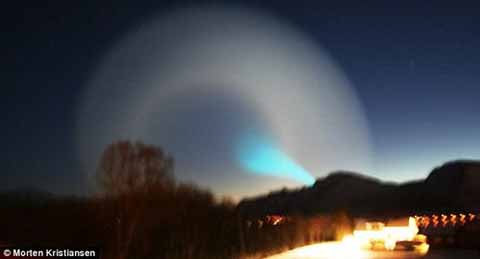 挪威國內從Trndelag地區到芬蘭克地區的居民都觀測到了這個神秘藍色光線。從目擊者拍攝的照片中我們可以看到,有一股藍色光線從挪威國內的一座大山中升起后旋留在半空中,形成螺旋狀白色光圈。這個巨大的光圈停留在夜空中,藍色光線一直照耀著半空螺旋光圈的中心,整個過程大約持續10-12分鐘。