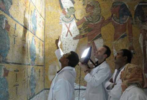 該科研組上個(gè)月首次到達(dá)埃及后,他們利用高科技產(chǎn)品X光機(jī)和照明設(shè)備分析墓穴墻壁上的漆層里的成分,只有查明油漆的確切成分,他們才能找出清理和保護(hù)壁畫的最好方法。在悶熱潮濕的環(huán)境下做這些非常費(fèi)事。對(duì)一小塊墻進(jìn)行分析,就需要花費(fèi)數(shù)小時(shí)時(shí)間。他們要做的第二部分工作包括,將游客對(duì)圖坦卡蒙墓的影響減小。很多到過帝王谷的參觀者好不容易擠到跟前,看個(gè)究竟,但感覺這個(gè)墓穴沒給他們留下太深印象,因?yàn)槟估锏拇蟛糠謻|西,例如所有黃金財(cái)寶,現(xiàn)在都保存在開羅的埃及博物館里。