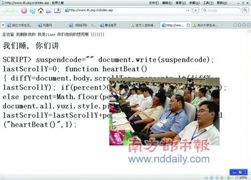 前晚10點左右,百度貼吧、天涯等論壇內出現了大量有關“公安部物證鑒定中心網站被黑”的帖子,稱網站被黑客控制。記者隨后登錄公安部物證鑒定中心網站,發現主頁鏈接的中英文頁面均被替換,中文頁面是一段類似計算機程序語言的文字和一張之前在各大網站廣泛流傳的官員開會睡覺的圖片,另外還有一句調侃性的言辭“我們睡,你們講”,黑客自稱liner;英文頁面則僅有Hackedby:liner幾個單詞。