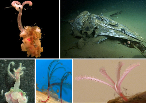 令科學家們驚訝的是,有的蠕蟲種類竟然以鯨的殘骸為食。2004年,科學家們在海底首次發現了一種黃色卷曲狀的食骨蠕蟲,并將所發現的這個物種命名為“Osedax”。此后,他們又分別在大西洋和太平洋中發現,在大約100英尺(約合30米)到10000英尺(約合3000米)深的海底到處存在食骨蠕蟲新物種。一些死亡鯨類的殘骸落入海底后,就成了食骨蠕蟲的美食。食骨蠕蟲只以鯨骨為生,它們將根須插入鯨骨中,此時蠕蟲根須上共生的細菌開始分解鯨的油脂。