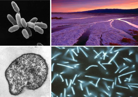 最近,研究人員在美國加利福尼亞死亡谷鹽灘地(右上圖)的地底下發現了一種遠古細菌。這種細菌也被稱為“古菌”。研究人員介紹說,古菌(左上圖和下圖)在過去34000年中僅僅以藻類的幾個細胞為生。這種細菌非常微小,長度大約只有1微米。它們很明顯呈現假死狀態,除了吸吮藻類的營養外,它們幾乎停止了所有的活動。它們吸吮藻類的營養用來修復自己慢慢損壞的DNA。一個小小的藻類細胞就足夠維持古菌生存長達1200萬年。