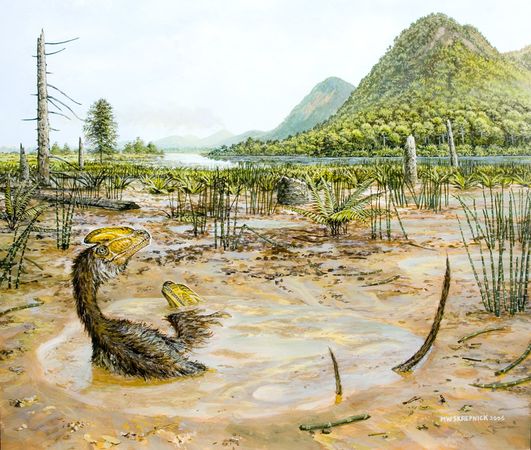 這幅繪畫作品展示了大約1.6億年前侏羅紀晚期的中國新疆地區,畫中的兩只食肉恐龍五彩冠龍在一個泥濘的深坑中苦苦掙扎。五彩冠龍是一種小型獸腳亞目食肉恐龍,它們是一種兩足猛禽家族成員,繼承了包括霸王龍在內的恐龍血統。