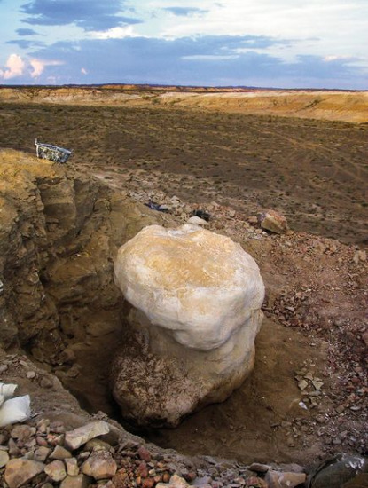 照片拍攝于2005年,展示了一個已被發掘的恐龍死亡坑。發掘工作造就了一個圓柱形沙巖和泥巖,高度在5.2英尺(約合1.6米)左右。迄今為止發現的死亡坑共有3個,里面埋藏著20多個小型恐龍的化石,這個石柱所在的死亡坑便是其中之一。由于周圍巖石的特性,專家們認為死亡坑實際上是凹陷所致,可能是巨大的腳印,里面充斥著泥漿。