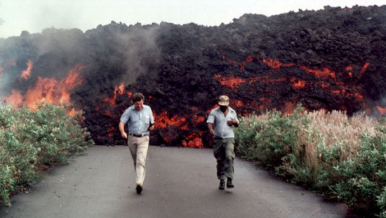這一令人吃驚的一幕發(fā)生在普奧(Puu Oo)火山口附近,最近夏威夷火山觀察站公開了這段錄像。熔融體并未顯示出遵從交通標(biāo)志“stop”停下來的意思,它從火山口洶涌流出,迅速奔向周圍的馬路,并流進(jìn)附近的皇家花園里。
