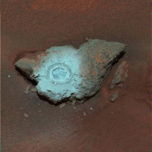本圖是“反彈巖石”的人工色調(diào)合成圖。圖片顯示的是它被巖石打磨工具打磨后的情形。