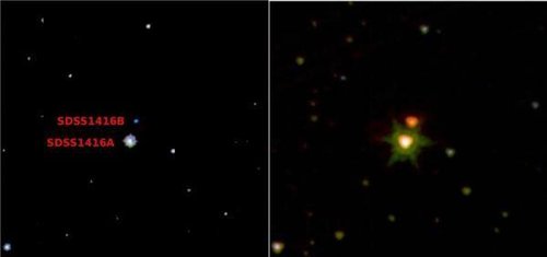 研究小組通過位于美國夏威夷的英國紅外望遠鏡(UKIRT)發現這顆褐矮星,令天文學家非常興奮的是這顆褐矮星奇特的色彩,它的顏色既不是純藍色,也不是純紅色。它現被命名為“SDSS1416+13B”,它位于一個較廣闊的軌道,環繞著一顆更明亮、溫度更高的褐矮星“SDSS1416+13A”運行,這兩顆褐矮星在可見光范圍下由斯隆數字天空勘測儀探測到,相比之下,SDSS1416+13B是唯一在紅外線下觀測到的褐矮星,它們距離太陽系15-50光年,這在天文學領域中是非常近的距離。