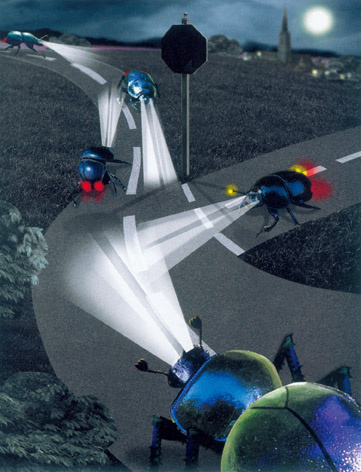 為了解決汽車夜視系統設計中所遇到的挑戰,馬德森和柳原弘道開始向自然界尋求靈感。在一次偶然的機會中,馬德森和柳原弘道獲知沃倫正在對夜間活動的昆蟲進行研究。馬德森和柳原弘道正在設計的夜視系統需要智能圖像處理技術的幫助,而這一技術正好使沃倫所推崇的夜間活動的昆蟲有了用武之地。沃倫的研究對象屎殼郎擁有一雙復眼,而復眼是由很多小眼組成。這些小眼能夠在感光細胞陣列上共同組成一副單一的圖像。從理論上講,昆蟲的小眼的夜視能力比人類的大眼睛差遠了。但是,昆蟲視覺系統有獨特的處理光信號方式,它們能夠更好地利用微光。隨著光線變得黯淡,昆蟲眼中的神經網絡既能從相鄰感光器獲取信號,也能將所收集的這些信號保存更長的時間。根據光線強弱、物體運動快慢,昆蟲會自主調節選擇哪種模式進行成像。