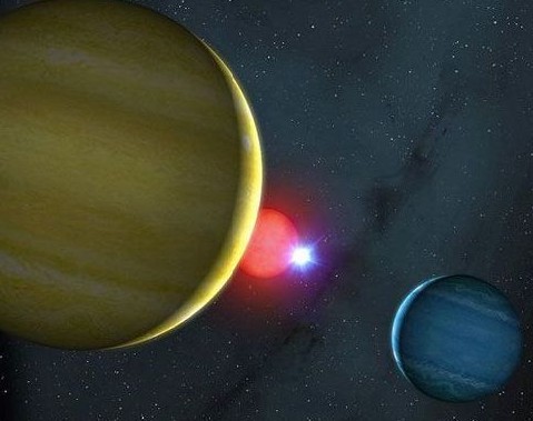 華威大學的湯姆-馬什教授表示,這兩顆氣態巨行星(gas giants)有著不同的質量,但它們實際上大小可能彼此相差不多。如果兩顆恒星和兩顆行星以目前觀測到的模式運行,并且呈現出黃色和藍色,那么這情景就像一個巨型斯諾克臺球:里面有一個紅球、兩個彩球和一個白球。”