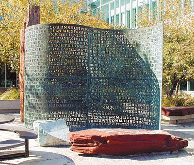 該面板名為“克里普托斯”(Kryptos,在希臘文解作“隱藏的”),由藝術家桑伯恩于20世紀90年代制成。它分為兩部分,左邊的面板雕上有待解密的文字,暗藏4段謎語;右面兩片面板則雕上用以解密的“鑰匙”。