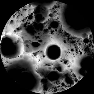 沙克爾頓隕坑直徑為19千米,深度為4千米,可清晰地看到位于該圖像的中心位置。月球南極位于圖像9點鐘位置。