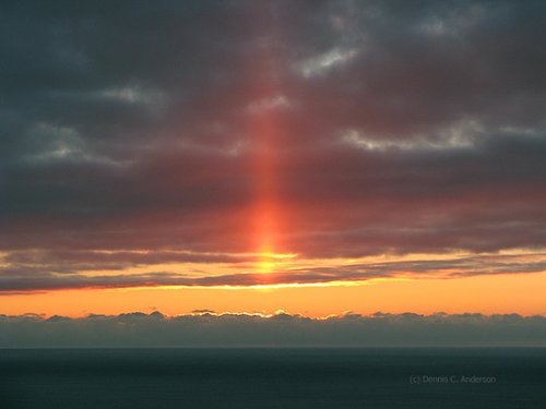 整個過程持續了10分鐘,克努夫對此十分困惑,于是向一個朋友(當地電視臺氣象員)打聽,得知這原來是一種稱為“太陽穗”的罕見現象。在英國,這種現象也叫做日柱或太陽光柱,是太陽上方的垂直光柱,偶爾也出現在太陽下面。它是由冰晶折射太陽光形成的,多數時候在日出或日落時分出現,那個時候,太陽低至地平線。