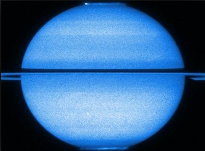 這張照片由美國宇航局哈勃空間望遠鏡拍攝,顯示的是土星幾乎水平“站立”的情景,此時它的光環幾乎消失不見。不過這也提供了一種難得的觀賞角度,照片中可以看到南北兩極,以及南北兩個極地出現的極光。圖片拍攝于2009年年初