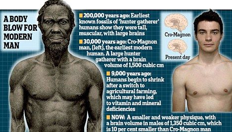 英國(guó)《每日郵報(bào)》報(bào)道,登上月球和征服珠穆朗瑪峰可能讓很多現(xiàn)代人認(rèn)為,我們做到了青出于勝于藍(lán),要比古代祖先更出色。然而,單就身體而言,我們已無(wú)法與古代祖先相提并論。根據(jù)英國(guó)科學(xué)家的研究,人類(lèi)的體型和大腦一直處于萎縮狀態(tài)。
