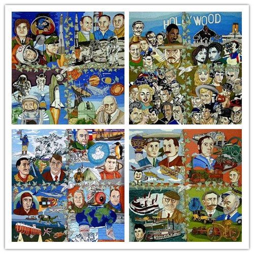 希瑟老太的掛毯部分。左上為“阿波羅”登月;右上為好萊塢;左下為人類探索地球;右下為人類發明的交通運輸工具。