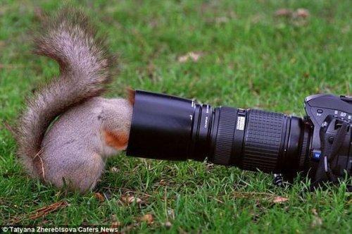 松鼠為找堅果頭部卡進相機鏡頭罩(組圖)