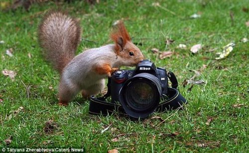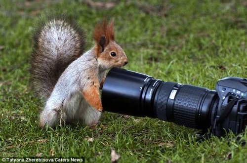 中國日報網訊 據英國《每日郵報》網站報道,烏克蘭攝影師塔季揚娜-熱列布佐娃近日在公園里抓拍到一只調皮松鼠為了尋找堅果差點被卡在相機鏡頭罩里的精彩照片。這只亮眼睛、長尾巴的松鼠藏好游客給的堅果后,又對塔季揚娜的一個相機產生了興趣。塔季揚娜說:“松鼠在鏡頭遮光罩里找堅果,然而很不幸,它的頭被卡住了。它折騰了好久,才終于把頭拔出來,實在是太可愛了!”