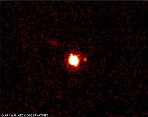 圖:這是夏威夷W. M. Keck 天文臺拍攝到的“厄里斯”的照片。圖片正中央就是厄里斯,月亮在其約三點鐘方位,是一個小紅點。