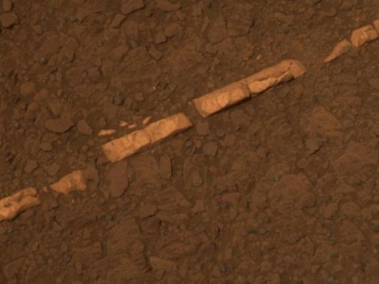 這是一處被稱為“霍姆斯特克”的石膏礦脈,照片由機遇號火星車的全景相機拍攝,其寬度約合人的大拇指相當(約1~2厘米),長度約40.6~50.8厘米,稍稍高出地表基巖
