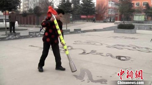 中新網(wǎng)訊 用自制一人高的巨型瓶筆,在地面上書寫10平米見方的大字,近日河南洛陽47歲書法奇人李一浩創(chuàng)新的書法形式,讓很多觀看的市民驚嘆不已。