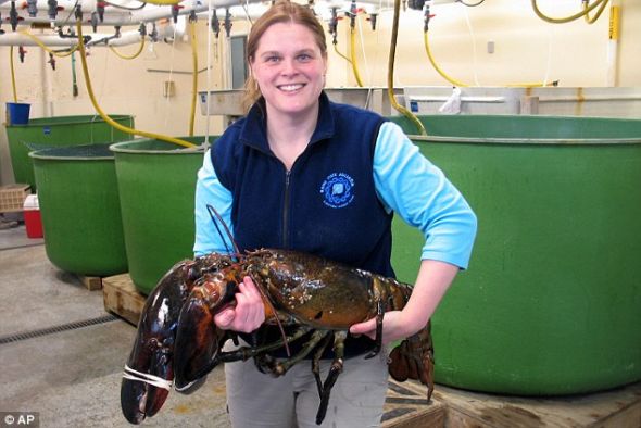 緬因州水族館館長艾米-海登-羅德里奎斯手里抱著一只名為“洛基”的巨型龍蝦,身長40英寸(約合1米),重27磅(約合12公斤)。