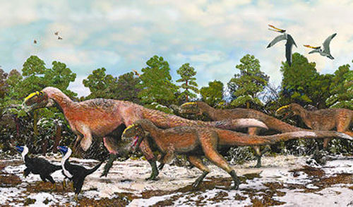 華麗羽王龍(大個)和其他帶羽毛恐龍復原圖。圖片由中科院古脊椎動物與古人類研究所提供