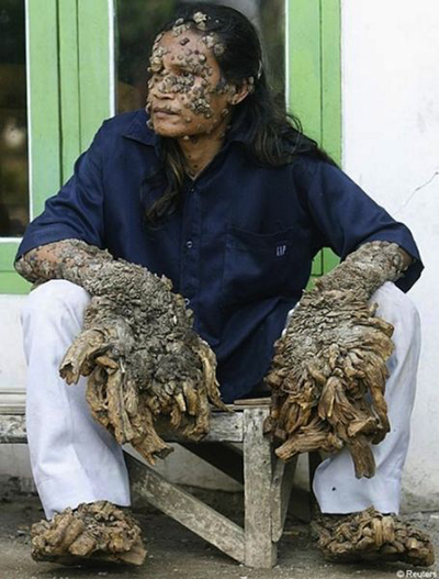 疣狀表皮發育不良患者也被稱之為“樹人”,很容易感染人乳頭狀瘤病毒,導致皮膚出現疣狀增生。80%的人感染這種病毒,但不會表現出任何癥狀。疣狀表皮發育不良患者手上和腳上出現大量疣狀角化增生,變成所謂的“樹人”。照片中的人名叫德德-科斯瓦拉,是最著名的疣狀表皮發育不良患者之一。照片被登在網上之后,他也因為這種可怕的疾病成為名人。科斯瓦拉一年要動兩次手術,切除角化增生。有一次,他切除的疣狀增生重量達到6公斤。