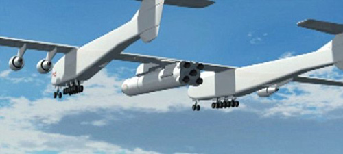艾倫和魯坦的上一次合作是實(shí)驗(yàn)性的太空船一號(hào),該船從一架特殊飛行器上發(fā)射升空。2004年它成為第一艘進(jìn)入太空的私人資助的載人飛船,稍后它因在兩周內(nèi)連續(xù)兩次試飛成功,獲得1000萬(wàn)美元安薩里X獎(jiǎng)獎(jiǎng)金。理查德-布蘭森爵士獲得這項(xiàng)技術(shù)的許可,目前正在研制用來(lái)把游客送入太空的太空船二號(hào)。這架新飛機(jī)的翼展將是380英尺(115.82米),是世界上最大的。這架飛機(jī)爬升到地球大氣層后,將借助它自己的助推火箭進(jìn)入軌道。不用耗費(fèi)火箭燃料從地球上發(fā)射,這種方法節(jié)省了很多錢(qián)。另一家更加古老的火箭公司——軌道科學(xué)公司在用這種方法研制無(wú)人火箭,用來(lái)發(fā)射衛(wèi)星。