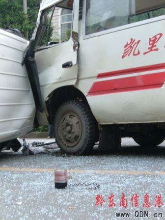 據(jù)目擊者楊先生向記者介紹了車禍發(fā)生的過程,8點16分左右,他正路過此地,從某小區(qū)里駛出一輛越野車,從火車站方向駛來的運鈔面包車避讓不及發(fā)生追尾刮擦,隨后,中巴車駕到,又與運鈔面包車猛烈相撞,面包車車頭擋風玻璃被撞成了一條“玻璃毯”“鑲”在了駕駛室內(nèi),面包車側(cè)翻橫于路中央。車上人員被困,凱里消防官兵接到報警急速趕到,經(jīng)過10多分鐘的營救,傷者被救出,早已等候在此的120救護車載著傷者向醫(yī)院奔去。