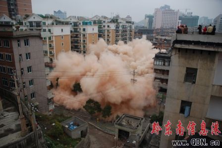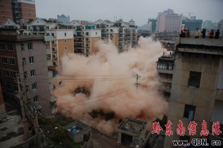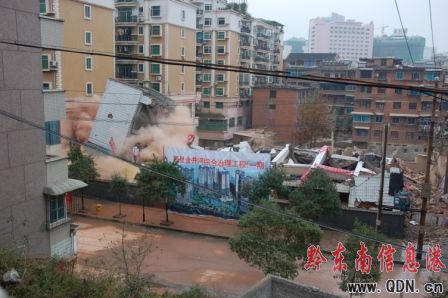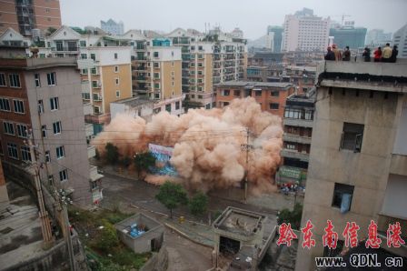 據悉,這兩幢處于鬧市居民區的樓房為凱里市國土局辦公樓及宿舍樓,均為磚混樓房,一幢為3層樓房,另一幢為5層樓房。當日,有關部門組織公安、消防人員逐一將爆破范圍內商場和居民區人員以及路人疏散至安全區域后,于上午10時35分對兩幢樓房實施爆破。由于第一次爆破未完全拆除,隨后于11時05分又進行第二次爆破,最終將兩幢樓房完全拆除。