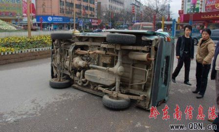 凱里市市中心大十字,一輛微型面包車與一輛小轎車發生擦掛,導致面包車側翻,所幸無人員傷亡。(吳攝)