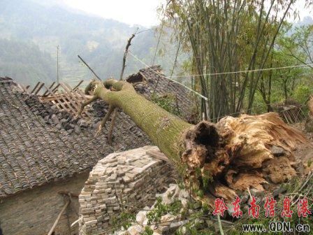 本港訊 4月2日凌晨,一場雷雨暴風過后,凱里市旁海鎮水珠村第六組村民吳榮勇家房屋旁邊的一株百年古楓香樹突然倒下,將吳家一棟木房從中斷攔腰壓垮,導致木房嚴重損毀,無法居住,且危險重重。由于古樹巨大,無法搬動,目前吳榮勇家一家8口人只得擠在一間偏房中棲息。