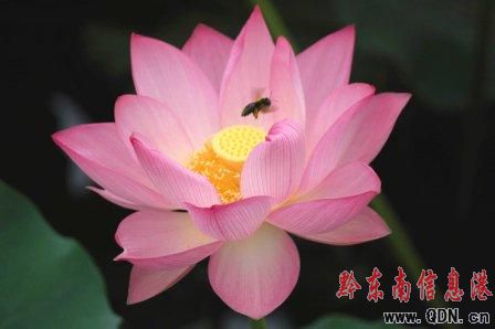 圖片:一只蜜蜂在荷花花蕊間飛舞采蜜及盛開的荷花。