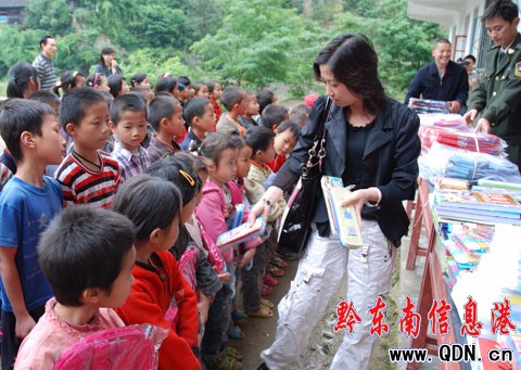本港訊 (記者 楊驥 攝影報道)5月27日,貴州省凱里公路管理段為三棵樹鎮季刀村苗寨的教學點60多名小學生捐獻價值4千多元的少兒讀物、文具和體育用品等,提前給苗族小朋友過“六.一”兒童節。圖為2009年5月27日,凱里公路管理段工作人員在給小學生發放書包、文具和閱讀公路部門捐獻的圖書。