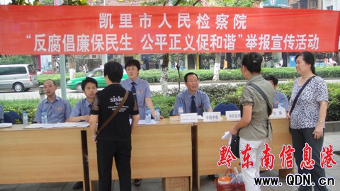 本港訊 (記者 劉仙)昨日,凱里市人民檢察院在大十字中國銀行門口 “擺攤、設點”,開展“舉報宣傳周”的活動,主題是“反腐倡廉保民生,公平正義促和諧”。