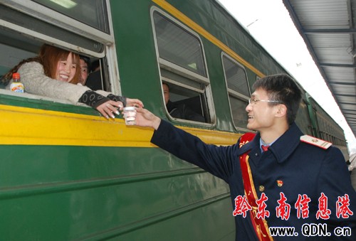 1月27日(春節后第五天),凱里火車站黨員志愿者在站臺上為返程務工的農民工倒水。
