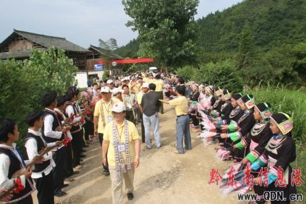 聞訊等候他們的侗族群眾們身著民族盛裝為他們舉行濃重的“攔路迎賓”儀式,向他們敬獻侗族姑娘手工制作的精美花帶,婦女們端來熱氣騰騰、香氣撲鼻的侗鄉油茶讓客人品嘗,聽罷被譽為“東方美聲唱法”的洪州琵琶歌后,他們贊不絕口,情不自禁地邀請姑娘、小伙們合影留念。晚上