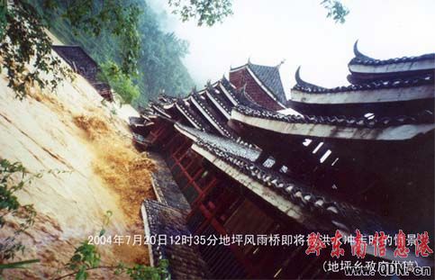 (圖片:風雨橋被沖毀一瞬;風雨橋雄姿。均為網上下載資料圖片。)