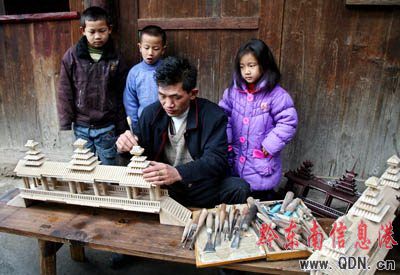 黔東南苗族侗族自治州黎平縣肇興鎮(zhèn)有一位有名的木雕藝人叫龍世興,他的拿手絕活是用木頭雕刻侗家風(fēng)雨橋。仔細(xì)看看眼前這一個(gè)個(gè)雕刻精致的工藝品,它把小小的侗寨與大千世界連為一體。(記者 彭年/攝)