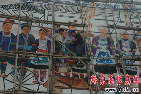 本港訊 (特約記者 陸書明 攝影報道)昨日,黎平縣委縣政府為了豐富重點旅游線路上的民族文化色彩,在縣城通往肇興的旅游線路上的羅寒、中潮、潘老、皮林等村寨,組織本縣的鐘聲和、曹東生等民間畫家和藝人,創作了反映民族風情的9幅巨型壁畫。圖為他們正在中潮村給巨型壁畫手工增添色彩的情形。