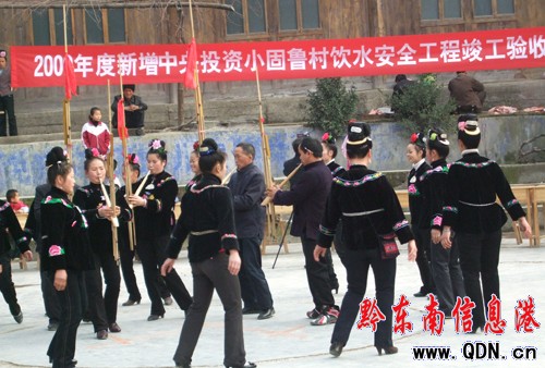 本港訊 (特約記者 張希才 攝影報(bào)道)“過(guò)去我們小固魯村為水愁,一到冬季小水井涸人畜飲水要到河里去挑,人們吃的是你在上面洗我在下邊挑的很不安全的水,感謝當(dāng)?shù)攸h委政府和水利部門的關(guān)心,興建了蓄水池,安裝了自來(lái)水管,將山泉引到各家各戶,現(xiàn)在擰開水龍頭,就能用上放心的安全水。”這是1月19日雷山縣丹江鎮(zhèn)小固魯村舉行2009年新增中央投資小固魯村飲水安全工程竣工驗(yàn)收典禮大會(huì)上,一位年近七旬苗族老人李茂林接受筆者采訪時(shí)高興地說(shuō)。