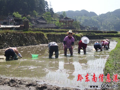 每年春節過后,該縣都有三四萬名男勞力外出務工或經商。針對一些農戶春耕春種相對困難的實際,該縣在組織農業、計生、金融部門搞好服務的同時,還積極引導農村留守婦女發揚團結互助精神,有力出力,有錢墊資,有技傳技,調劑使用農機具,組建“春耕互助組”,不僅解決了單戶勞動力不足現象,還提高了工作效率,減少了投入成本,為全縣的春耕生產注入了新的生機和活力。圖為雷山縣丹江鎮水電村“留守婦女互助組”在田間互助點秧苗的情景。