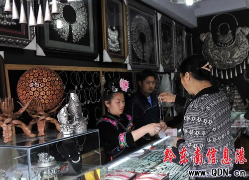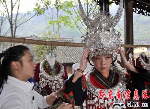 (游客在西江鎮千戶苗寨穿戴苗族服飾)
