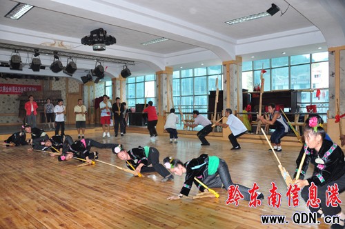 本港訊 (余德利 特約記者 張希才 攝影報道)8月18日,黔東南州委常委、副州長趙至敏在州政府副秘書長楊解生及州民委相關領導的陪同下深入雷山縣檢查指導貴州省七屆少數民族傳統體育運動會參賽項目《搓敢嬉對》排練工作進展情況。