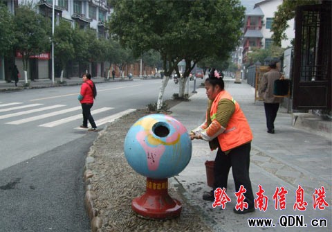 本港訊 (特約記者 張希才 攝影報道)連日來,在雷山縣城的大街小巷和民族廣場,隨處可見身著黃色衣服的清潔工打掃衛(wèi)生,迎接2010年元旦節(jié)的到來。